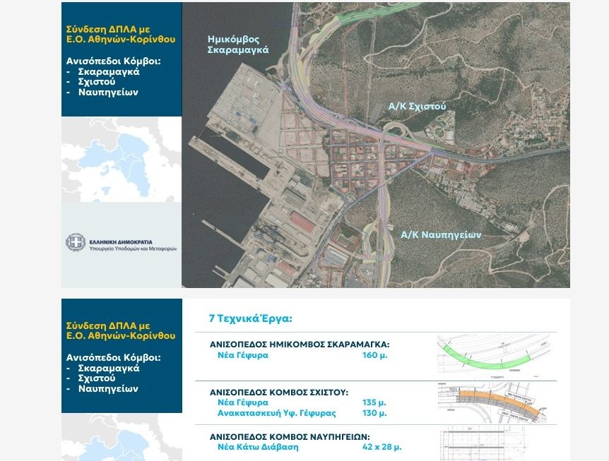 - Αναβάθμιση της Εθνικής Οδού Αθηνών–Κορίνθου με τρεις λωρίδες κυκλοφορίας στην περιοχή των κόμβων Σχιστού–Σκαραμαγκά.