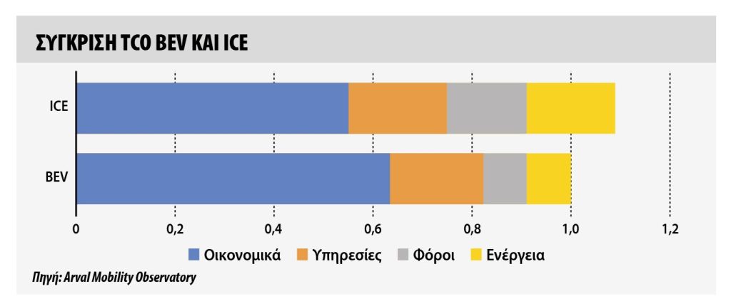 Αν και οι τιμές καταλόγου των BEV είναι υψηλότερες από των αντίστοιχων οχημάτων ICE, τα ηλεκτρικά αυτοκίνητα έχουν χαμηλότερα λειτουργικά και συντηρητικά κόστη — γεγονός που γέρνει την πλάστιγγα του TCO υπέρ τους, σύμφωνα με την Arval. Επιπλέον, η εταιρεία χρηματοδοτικής μίσθωσης προβλέπει ότι τα μικρότερα BEV (με αυτονομία έως 300 χλμ.) θα είναι φθηνότερα από τα αντίστοιχα ICE έως το 2028.
