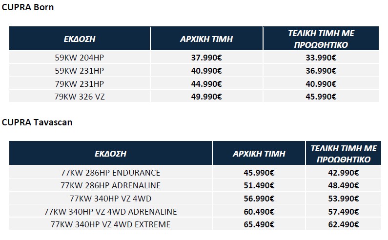 Επιπλέον, για όλες τις εκδόσεις των αμιγώς ηλεκτρικών μοντέλων της μάρκας, που προσφέρονται σε νέες ανταγωνιστικές τιμές , CUPRA Born και Tavascan, ισχύουν προωθητικά οφέλη ύψους €4.000 και €3.000 αντίστοιχα: