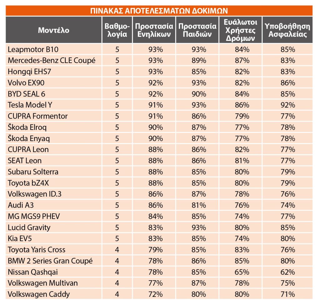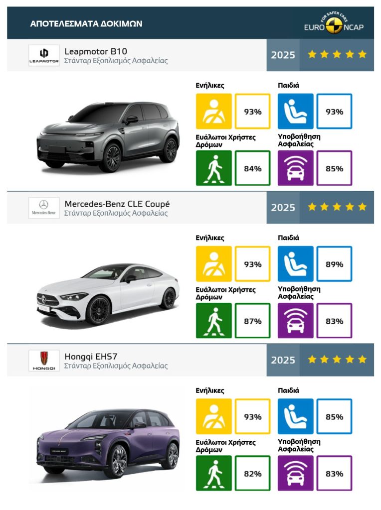 Από τα 23 οχήματα, τα εννέα σημείωσαν 90% ή υψηλότερη βαθμολογία στην Προστασία Ενήλικων Επιβατών. Επικεφαλής της ομάδας ήταν τα Leapmotor B10, ένα μεσαίου μεγέθους ηλεκτρικό SUV, η Mercedes-Benz CLE Coupé, ένα πολυτελές κουπέ, και το Hongqi EHS7, επίσης μεσαίου μεγέθους ηλεκτρικό SUV, με όλα να συγκεντρώνουν εντυπωσιακό 93% και συνολική πεντάστερη αξιολόγηση.