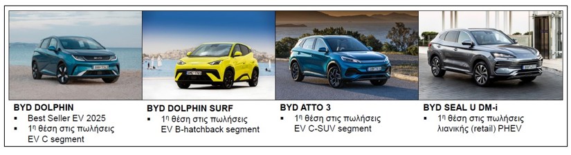 Η BYD ηγείται της αγοράς ηλεκτρικών οχημάτων στην Ελλάδα, καταγράφοντας 1.825 ταξινομήσεις EV και κατακτώντας πάνω από το ένα πέμπτο της αγοράς (με συνολικό μερίδιο αγοράς 20,5%). Αξιοσημείωτο είναι το γεγονός ότι το μερίδιο της BYD στο κανάλι πώλησης λιανικής (retail) άγγιξε το 31,2%, αποτυπώνοντας την εμπιστοσύνη των ιδιωτών πελατών στην εταιρεία! Παράλληλα, η μάρκα ενισχύει σταθερά τη θέση της και στα plug-in υβριδικά (PHEV), επιβεβαιώνοντας τη στρατηγική της σε όλες τις μορφές εξηλεκτρισμού με εξωτερική παροχή ενέργειας.