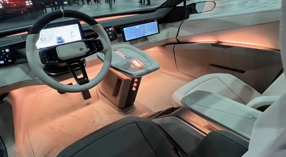 Το εσωτερικό παραμένει εμφανώς πρωτότυπο, με κεντρική κονσόλα που αναδύεται από το επίπεδο πάτωμα της πρώτης σειράς, επίπεδη επιφάνεια και διακοσμητικό μοχλό αλλαγής ταχυτήτων.