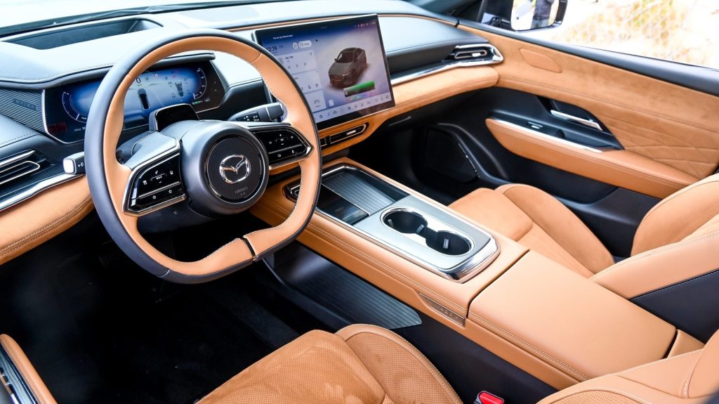 Τα mono-form καθίσματα με ενσωματωμένα προσκέφαλα προσφέρουν υψηλή άνεση και μια σύγχρονη, ενιαία αισθητική. Η Mazda προσφέρει μια επιλογή από ταπετσαρίες υψηλής ποιότητας: Ζεστό μπεζ ή μαύρο τεχνητό δέρμα στην έκδοση Takumi και πολυτελές υφασμάτινο ύφασμα Tan Nappa και Suede στην έκδοση Takumi Plus. Οι διακριτικές σατινέ πινελιές και οι λεπτομερείς ραφές ολοκληρώνουν την εκλεπτυσμένη, σοφιστικέ εμφάνιση.