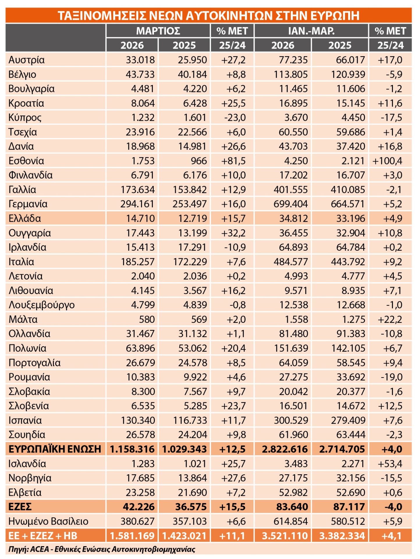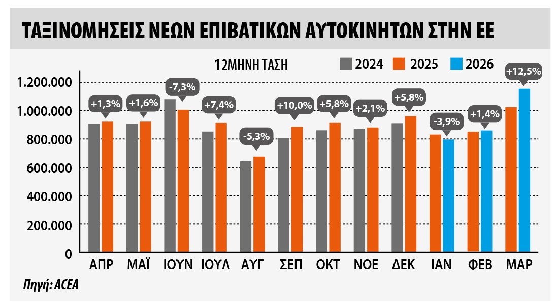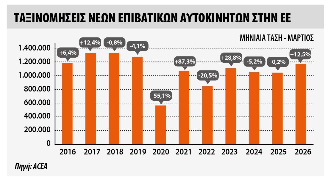 Η ευρωπαϊκή αγορά αυτοκινήτου δείχνει να βρίσκει ξανά ρυθμό, με τον Μάρτιο να κλείνει δυναμικά και να δίνει σαφές στίγμα ανάκαμψης. Στην Ευρωπαϊκή Ένωση, οι ταξινομήσεις νέων αυτοκινήτων έφτασαν τις 1.158.316 μονάδες, αυξημένες κατά 12,5% σε σχέση με πέρυσι, ενώ στο σύνολο του πρώτου τριμήνου η αγορά κινείται ανοδικά κατά 4,0%, αγγίζοντας τα 2.822.616 οχήματα σύμφωνα με τα στοιχεία της Ένωσης Ευρωπαίων Κατασκευαστών Αυτοκινήτων (ACEA). Πίσω από τους αριθμούς, ξεχωρίζουν αγορές που ωθούν ανοδικά το σύνολο. Η Γερμανία κατέγραψε άνοδο 16,0% τον Μάρτιο, η Γαλλία 12,9% και η Ισπανία 11,7% επιβεβαιώνοντας τη δυναμική των μεγάλων αγορών. Την ίδια στιγμή, εντυπωσιακές επιδόσεις σημειώνονται και σε μικρότερες χώρες, όπως στην Εσθονία με άλμα 81,5%, και στην Ουγγαρία με 32,2%, δείχνοντας ότι η ζήτηση επανέρχεται με ένταση, έστω και ανομοιόμορφα. Σε ευρύτερο ευρωπαϊκό επίπεδο, μαζί με τις χώρες της ΕΖΕΣ και το Ηνωμένο Βασίλειο, οι ταξινομήσεις ανήλθαν τον Μάρτιο σε 1.581.169 μονάδες, αυξημένες κατά 11,1%, ενώ στο τρίμηνο διαμορφώθηκαν σε 3.521.110 οχήματα, με άνοδο 4,1%.