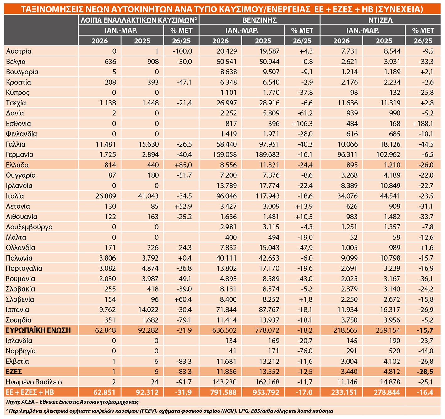 Στον αντίποδα, τα βενζινοκίνητα και τα ντίζελ συνέχισαν την καθοδική τους πορεία σε όλη την Ευρώπη. Η βενζίνη υποχώρησε κατά 17% στις 791.588 ταξινομήσεις, με σημαντικές απώλειες σε μεγάλες αγορές όπως η Γαλλία και η Γερμανία. Το ντίζελ κατέγραψε ακόμη μεγαλύτερη πίεση, μειούμενο κατά 16,4% στις 233.151 μονάδες, επιβεβαιώνοντας τη σταδιακή απομάκρυνση από την τεχνολογία. Η πτώση αυτή αντανακλά κανονιστικές πιέσεις, αλλαγή προτιμήσεων του καταναλωτικού κοινού και τη σταθερή διείσδυση των εναλλακτικών μορφών ενέργειας.