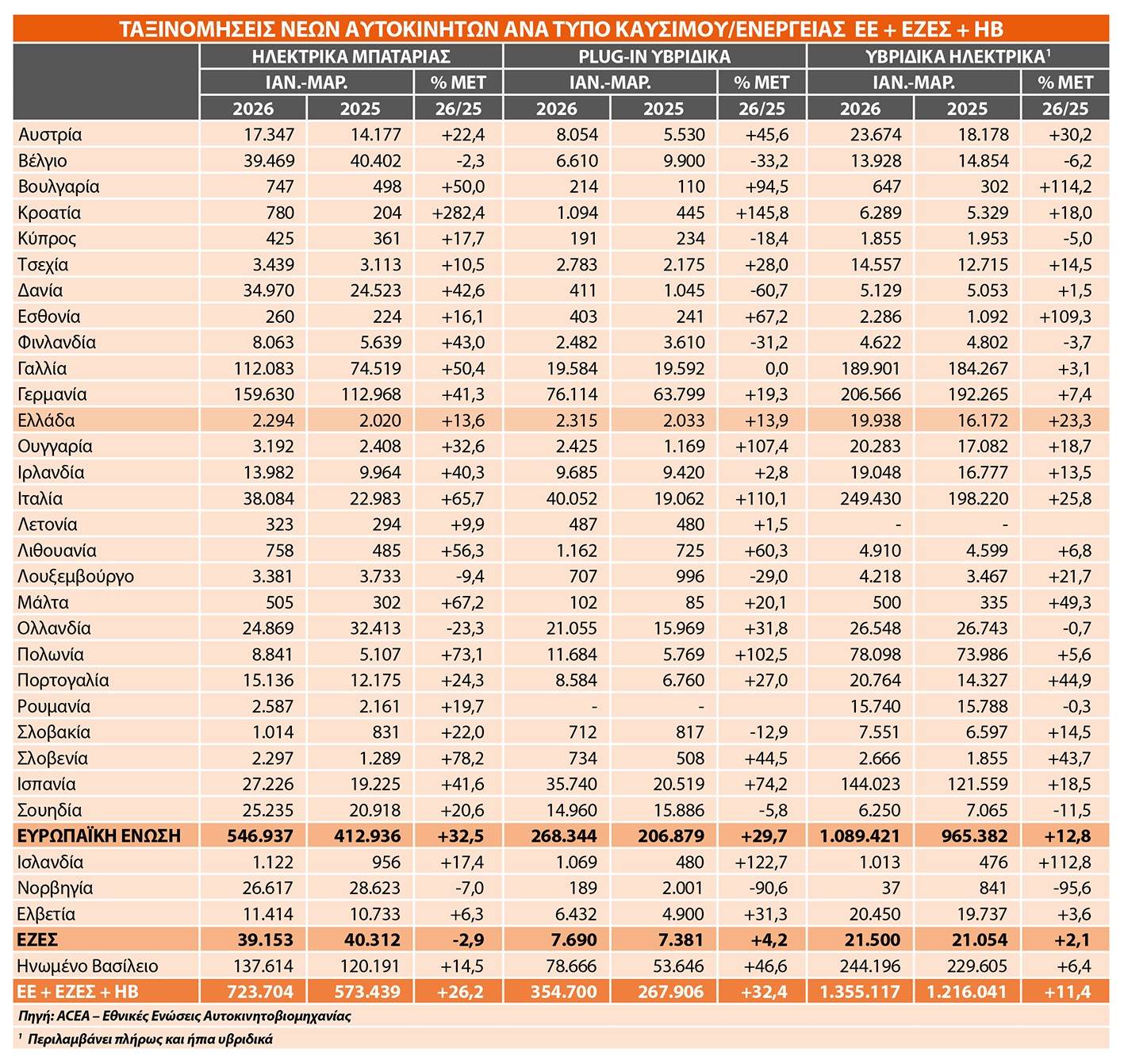 Στο σύνολο της αγοράς ΕΕ, ΕΖΕΣ και ΗΒ το πρώτο τρίμηνο του 2026, η εικόνα ανά πηγή ενέργειας επιβεβαιώνει τη σαφή στροφή προς τον εξηλεκτρισμό. Τα αμιγώς ηλεκτρικά έφτασαν τις 723.704 ταξινομήσεις με άνοδο 26,2%, ενώ τα plug-in υβριδικά αυξήθηκαν ακόμη περισσότερο κατά 32,4% στις 354.700 μονάδες. Τα υβριδικά διατηρούν τον όγκο τους με 1,35 εκατ. οχήματα και άνοδο 11,4%. Αντίθετα, τα συμβατικά καύσιμα υποχωρούν, με τη βενζίνη στις 791.588 μονάδες και -17% και το ντίζελ στις 233.151 με -16,4%, αποτυπώνοντας μια δομική αλλαγή.