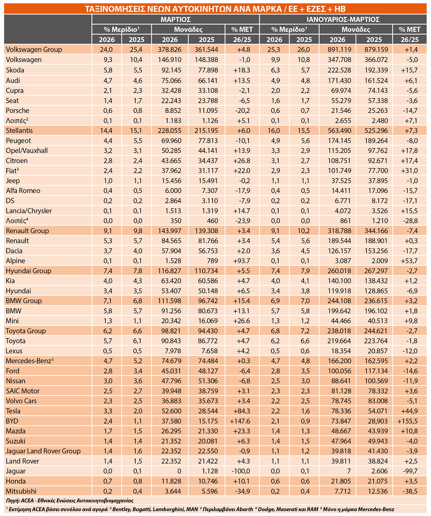 Σε επίπεδο ομίλων, η εικόνα της ευρωπαϊκής αγοράς παραμένει σταθερή, αλλά με ενδιαφέρουσες μεταβολές σε επίπεδο εταιρειών. Στην κορυφή παραμένει ο όμιλος Volkswagen, αν και με μειωμένο μερίδιο 24,0% από 25,4%, σημειώνοντας άνοδο 4,8% με 378.826 μονάδες. Η βασική μάρκα Volkswagen υποχώρησε οριακά κατά 1,0%, αντίθετα, Skoda και Audi ενισχύθηκαν δυναμικά με +18,3% και +13,5% αντίστοιχα. Ο όμιλος Stellantis ακολουθεί με 14,4% μερίδιο και αύξηση 6,0%, με τη Citroen να ξεχωρίζει εντυπωσιακά στο +26,8% και τη Fiat να εκτοξεύεται στο +22,0%, ενώ η Peugeot κινμήθηκε πτωτικά. Στον αντίποδα, το Renault Group εμφάνισε μία πιο συγκρατημένη άνοδο 3,4%, με τη Renault στο +3,4% και τη Dacia στο +2%. Ιδιαίτερο ενδιαφέρον παρουσιάζει η ισχυρή άνοδος του BMW Group κατά 15,4%, με τη Mini να ξεχωρίζει στο +26,6%, αλλά και η σταθερή πορεία του Hyundai Group στο +5,5%. Στον χώρο των ιαπωνικών εταιρειών, η εικόνα είναι μικτή, με το Toyota να κινείται θετικά στο +4,7%. Το πιο χαρακτηριστικό στοιχείο της περιόδου είναι η έντονη άνοδος των κατασκευαστών ηλεκτρικών αυτοκινήτων, όπως της Tesla με την ισχυρή άνοδο κατά 84,3%. Η κινεζική παρουσία στην ευρωπαϊκή αγορά συνέχισε να ενισχύεται με ταχείς ρυθμούς, με τη BYD να ξεχωρίζει καταγράφοντας άλμα 147,6% τον Μάρτιο και τη SAIC Motor να διατηρεί σταθερά ανοδική πορεία στο +3,1%. Φυσικά η διείσδυση αυτή δεν είναι συγκυριακή και αποτυπώνει τη στρατηγική επέκτασης των κινέζων κατασκευαστών, κυρίως μέσω των ανταγωνιστικών ηλεκτρικών μοντέλων τους.